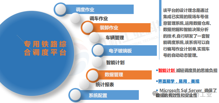 专用铁路综合调度平台根据企业铁路量身定制,包括微机联锁控制系统、道口报警控制系统、现车管理信息系统、货运计划管理系统、车号自动识别应用系统。