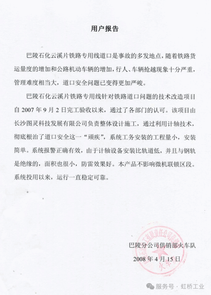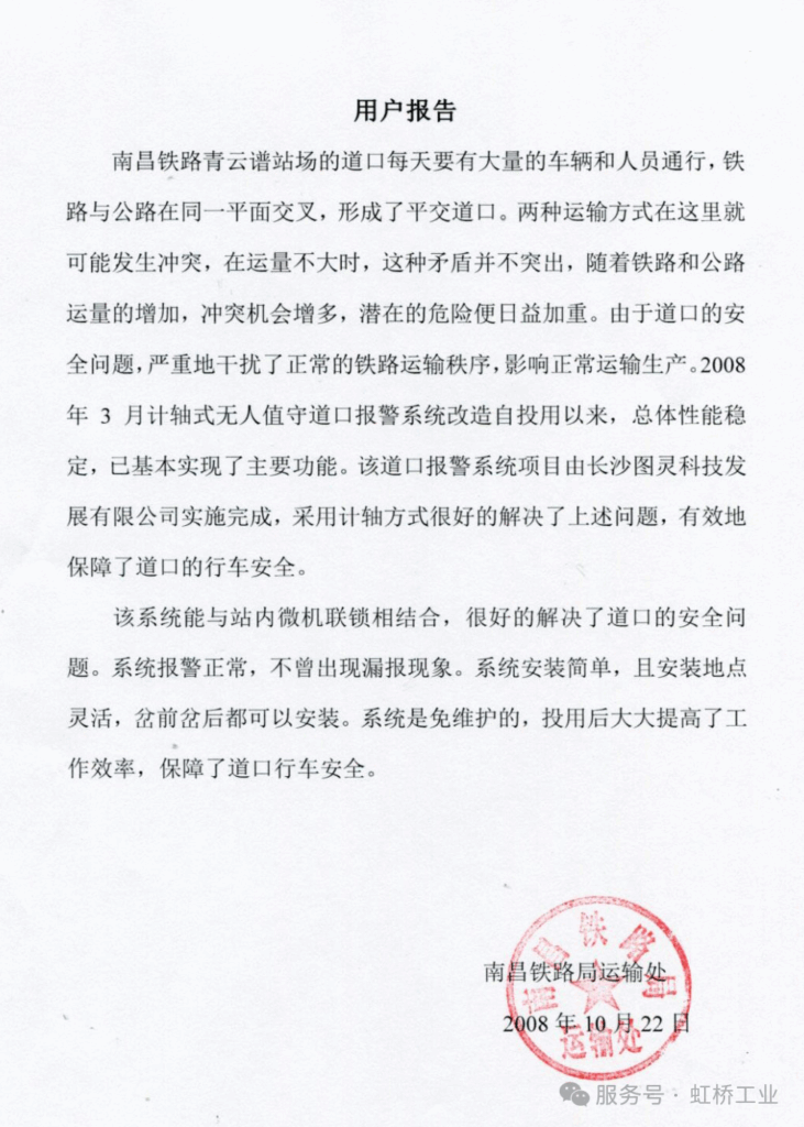 本系统的开发适合于企业铁路道口现场需要,当列车经过道口时,该系统能自动报警,以提醒行人注意安全, 保障了道口安全。通过采用铁路上传统的计轴方式,这种方式稳定可靠不受其它因素影响。