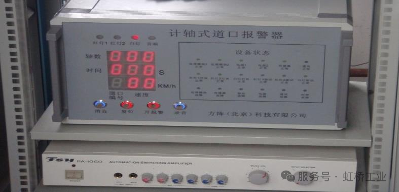 当火车进入道口预警区域4个轴报警器发出报警信号灯由白灯转换为红灯,两个红灯交替闪烁,同时启动功放,并把“火车来了,请注意”的音频信号送到功放,约5秒钟后,道口两侧的防水音箱发出“火车来了,请注意”,当火车最后一个车轮离开道口的传感器,信号灯重新转换为白灯,功放关闭,音箱静音,火车再经过另一只传感器,报警器不会发出报敬
