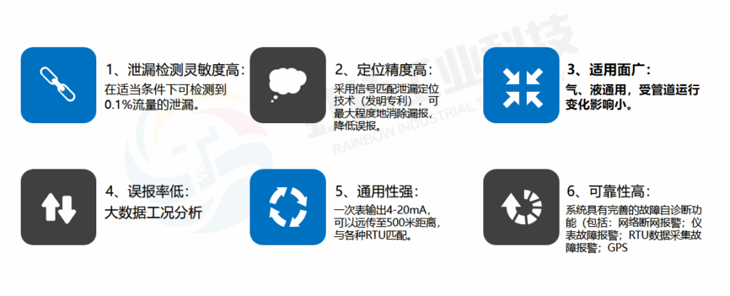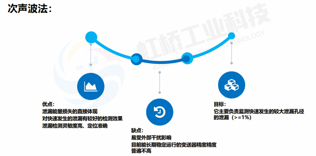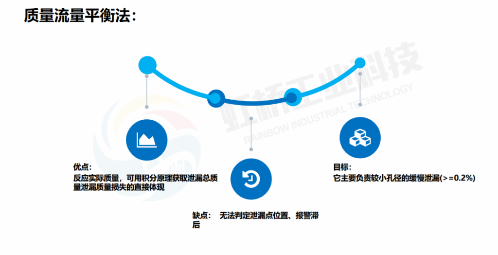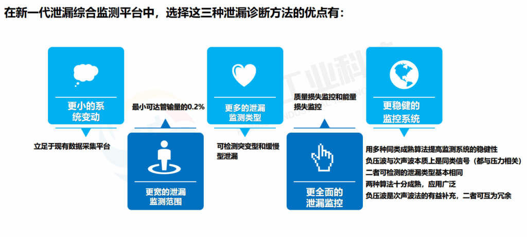 通过组合次声波法、负压波法和质量流量平衡法三种管道泄漏监测技术,三种技术相互补充又各自发挥自身优点,根据现场条件,质量流量平衡法为可选的组件。