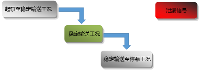 实际运行中,工况多变,比如启停泵,调压等。这些很容易被当作是泄信号若不处理,则易发生说报。不同工况之间变化,只有变换的瞬间前后有限时间才能较好地获取工况特征。该系统至少建立4类特征库,起泵至稳定输送、稳定输送、稳定输送至停泵以及泄漏信号特征库。