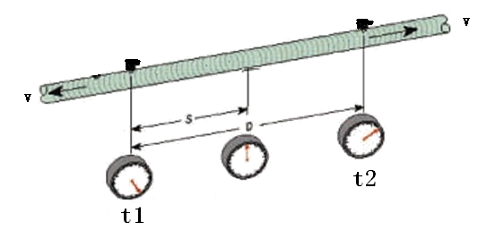 当管道中某一位置发生了泄漏,必然引起管道内压力的扰动,由此产生声波信号。该声波信号向管道的两端传播,假设该声波信号t1时刻传播到首站,t2时刻传播到末站,定位公式:s=L/2+(t1-t2)/2*V