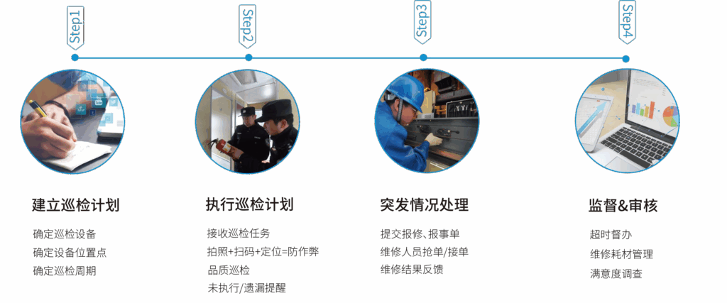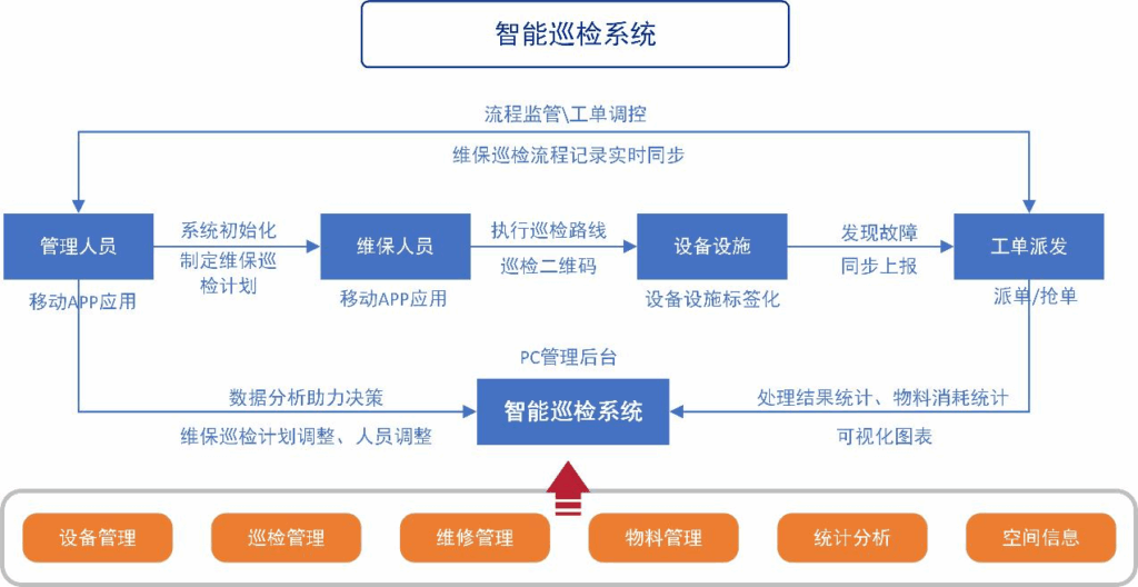 智能巡检模块通过配置智能巡检终端、巡检管理软件等,实现巡检点、巡检项,巡检路线、巡检计划等的信息化管理,巡检操作执行过程的智能化执行、实时监测和沟通,巡检数据的及时回传和巡检完成情况的统计分析与考核。建立巡检管理系统,巡检PDA和巡检定位系统整合,通过无线网络传输,搭建实时在线巡检平台。