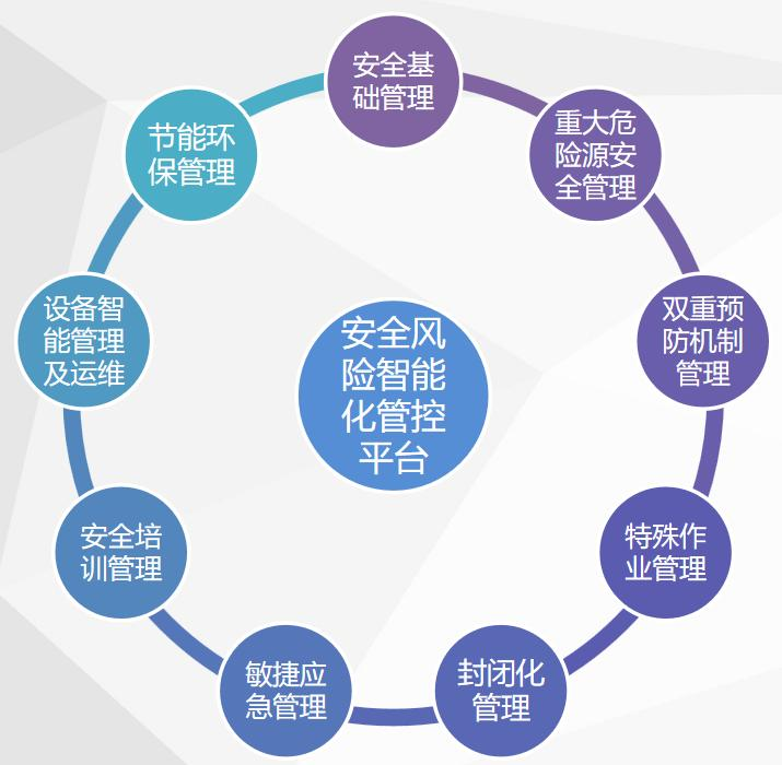 全面从化工园区和危险化学品企业智能化管控和危险化学品安全风险智能化管控为出发点,以有效防范化解重大安全风险为目标,进行化工园区和危险化学品企业安全基础管理、重大危险源安全管理、基于安全风险分级管控和隐患排查治理双重预防机制管理、 特殊作业管理、封闭化管理、敏捷应急管理、安全培训管理、设备智能管理及运维和节能环保管理等建设。