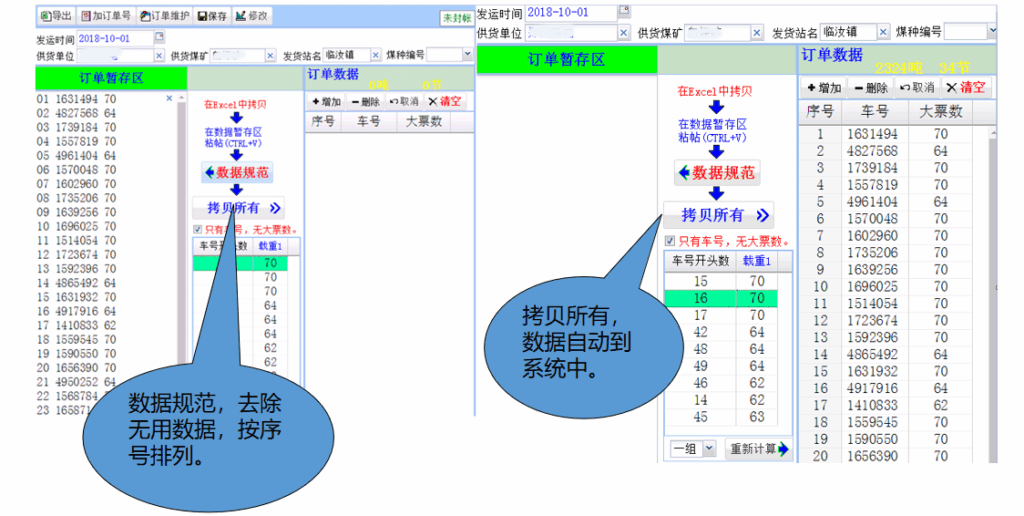 - 计量智能监控:通过自动采集或人工导入等手段,将入厂煤数据按照供应商、矿别、车次/船名、过衡时间/到港时间等规则归类形成批次数据,并对批次数据进行管理、确认,进行计量智能监控。