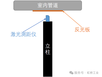 激光测距仪固定在黑色立柱上,反光板安装在室内管道上,通过镜反射原理测量。