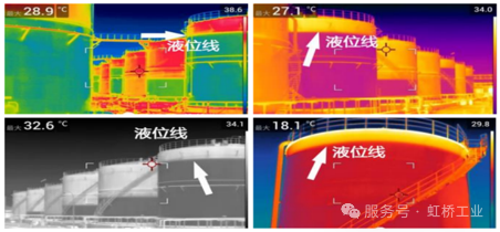 储罐内存储的液体本身与上部气体有温度差,或由于波体的挥发使上部气体混合罐内压力导致温差,这些温差传递到储罐外壳,就可以使用红外热像仪在储罐外部拍摄到液位线。(2)若储罐内的液体为常温,因为没有温差,故在环境温度恒定的情况下是无法看出液位线的;但当环境温度改变时,储罐内的液体的热容量比罐体上部空气的热容量大,在环境温度上升的过程中热容量大的液体比空气的升温慢,在罐体表面呈现出对应的空气的热容量高;在环境温度下降的下午则相反,这样就可以从罐体表面拍摄到内部存储液体的液位线。